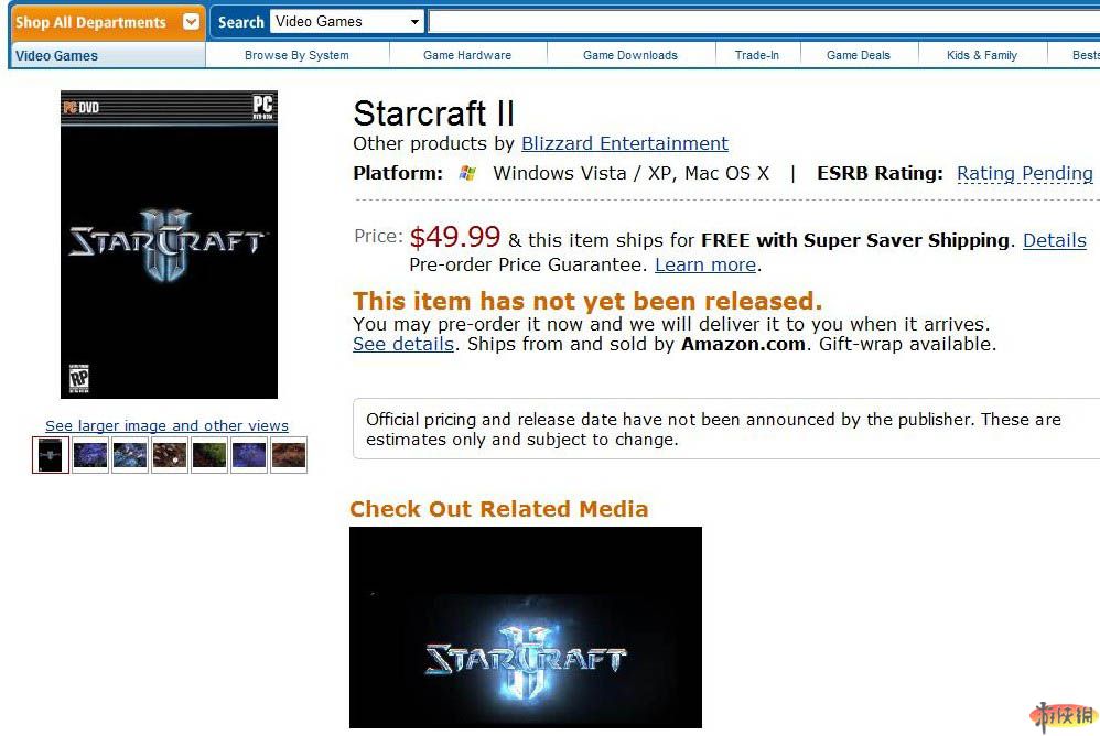 我們在亞馬遜網(wǎng)站上可以看到,《星際爭霸2(Starcraft II)》標價49.99美元。網(wǎng)站上的標注可以說是有鼻子有眼,但是這一消息的準確性就不得而知。