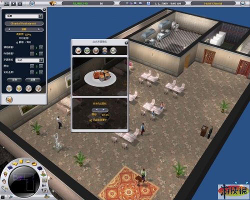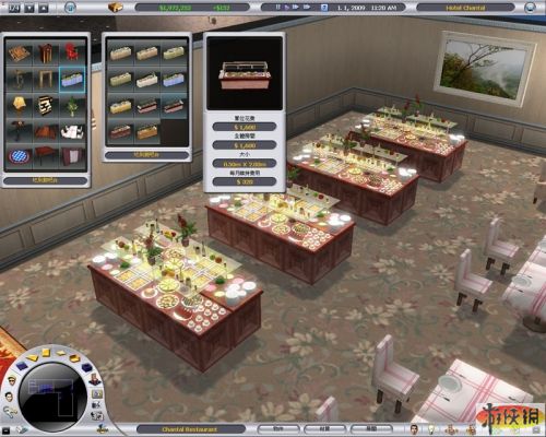 餐廳可以選擇供應(yīng)哪種料理,法、美、德、義式或是自助餐都行,玩家可以自行調(diào)整菜單內(nèi)容,而自助吧檯也有很多款式,從單純只舖上桌巾的桌子,到出現(xiàn)玻璃頂蓋預(yù)防顧客噴口水的款式都有,既然是品味高尚的法國(guó)人,筆者就選擇放置有玻璃頂蓋的自助吧臺(tái),不過(guò)價(jià)格也很高昂就是了。