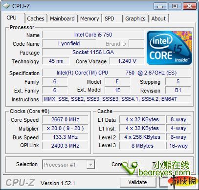 新版的CPU-Z已經(jīng)能夠查看新的Core i5處理器信息了,處理器型號Core i5-750,研發(fā)代號Lynnfield,采用LGA 1156接口,45nm工藝制程,默認(rèn)電壓1.240V,處理器主頻為2667MHz,倍頻X20,總線頻率133MHz,QPI頻率2400MHz,采用原生四核心,擁有8MB三緩共享式緩存。
