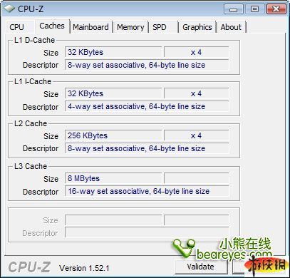 我們來看一下Core i5-750二三級緩存信息,二級緩存為256KBx4,共計1MB,三級緩存與Core i7系列一樣,同為8MB共享式三級緩存,大容量的共享式三級緩存對于處理器的性能提升還是很大的。