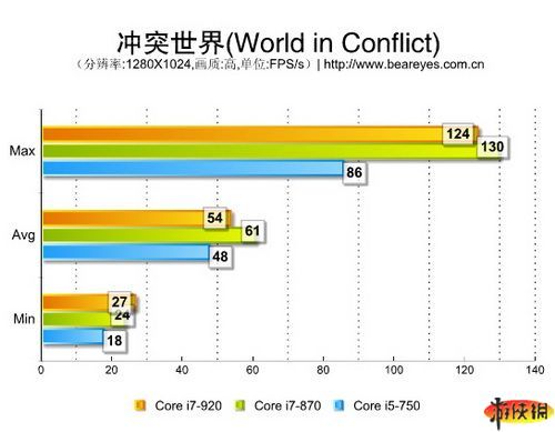 接下來,我們測試了一下沖突世界這款游戲,這款游戲?qū)τ谂渲玫囊蟛⒉皇翘撸瑥臏y試數(shù)據(jù)上來說,Core i7 870的成績相當(dāng)不錯(cuò),僅在最小幀數(shù)方面落后i7 920 3幀成績,而Core i7 750的成績雖與i7 870有差距,但是表現(xiàn)也可以說是很不錯(cuò)的。