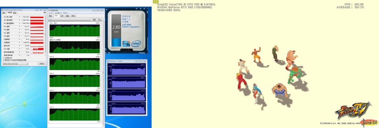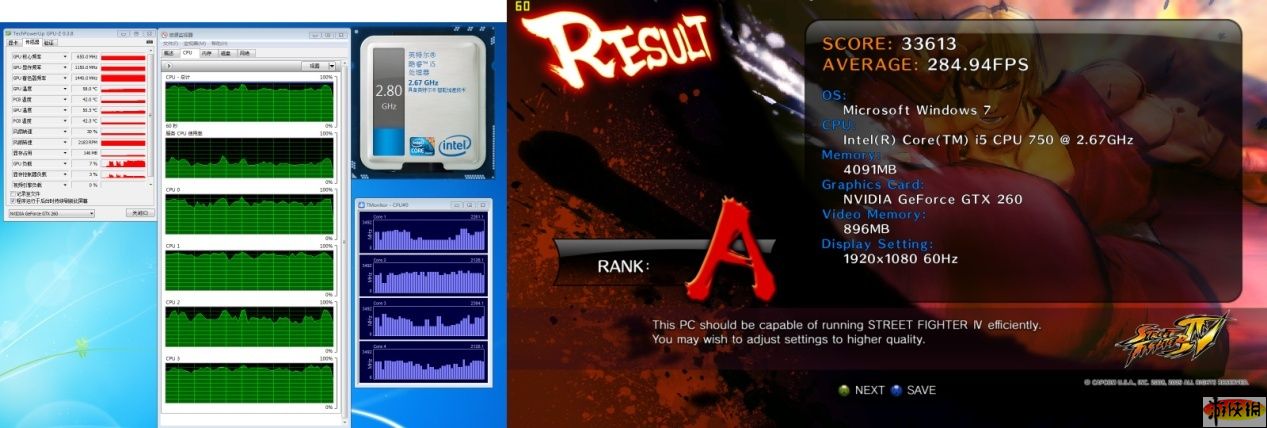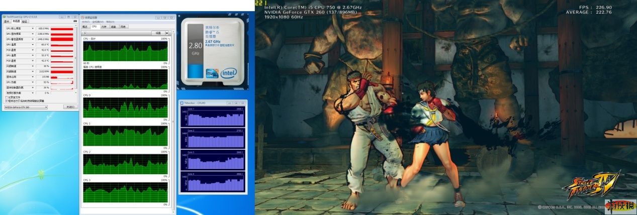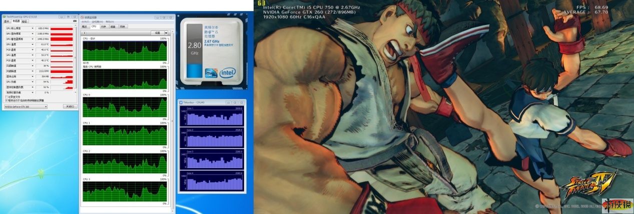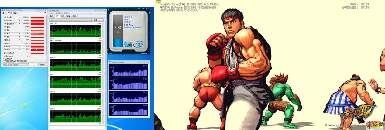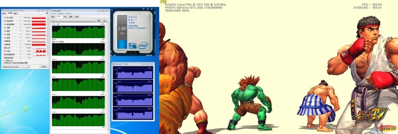 頂級畫質(zhì)下,酷睿i5俠風(fēng)不改,依舊四核2.80GHz,顯卡顯存占用提到的554MB,GPU負(fù)載在95%,顯卡控制器的負(fù)載從20%-30%提高到40%-50%。綜合之前對比,我們可以看出最高畫質(zhì)下顯卡性能成為幀數(shù)提高的瓶頸。而多模型場景的FPS只掉了數(shù)楨(之前降幅都在25%左右),CPU在建模運算方面發(fā)揮著重要作用。不論如何,暢玩最高畫質(zhì)的街頭霸王4絕對沒問題了!