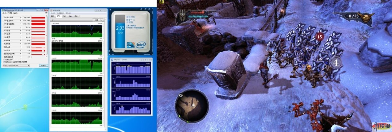實際游戲畫面FPS依舊保持60,看來垂直同步也是開啟了。不過咱們也不是精確評測,能看出變化為上!觀察監(jiān)測畫面,發(fā)現(xiàn)酷睿i5單核心自動超頻到2.93GHz。Tmonitor截屏中黃色部分就是睿頻的見證。畫質儼然好了不少。