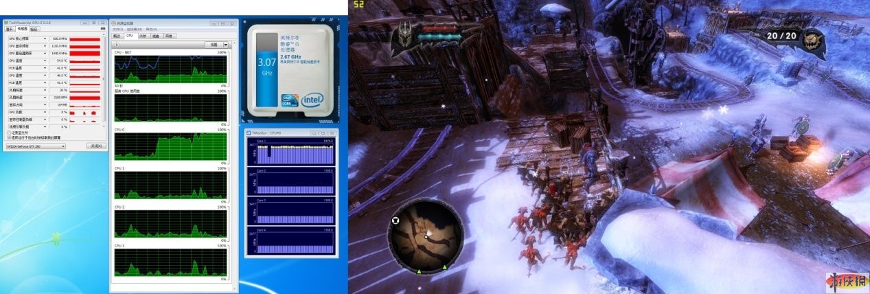 監(jiān)測軟件。首先當然是英特爾官方強烈推出的睿頻加速監(jiān)測桌面小工具。大俠功夫出沒出,看看此器就知曉??!然后是TMonitor,用來監(jiān)測4核心各自的資源占用情況,系統(tǒng)自帶的資源監(jiān)視器用來查看CPU60秒內的線性變化。另外一個GPU-Z,觀測顯卡資源狀況。
