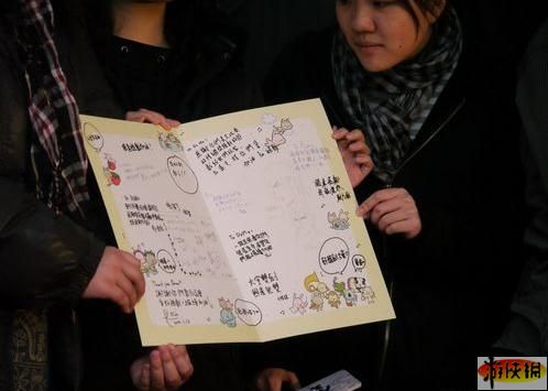 玩家偷偷安排了給DOMO 小組的驚喜,現(xiàn)場(chǎng)拿出三張寫(xiě)滿祝福話語(yǔ)的大卡片,送給研發(fā)團(tuán)隊(duì),以感謝并鼓勵(lì)研發(fā)團(tuán)隊(duì)辛苦研發(fā)出這款作品。