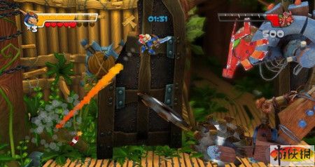 這種自負(fù)的游戲,也往往最令人嘆息。其實(shí)看看前幾關(guān)的表現(xiàn),《火箭騎士》只有杰出,沒有任何問題。對于一款2D橫向卷軸,平臺游戲,操作上的簡單解釋不必多說,而玩家能切身感受到手感的優(yōu)越,這就很了不起了。比如,你說《洛克人》系列手感好嗎?可能很多人習(xí)慣了洛克人的操作,但對于初學(xué)者而言,洛克人的操作別扭難以上手?!痘鸺T士》就不然,動作清晰速度感好,初期判定威力大,招式收發(fā)控制的好,允許玩家相當(dāng)次數(shù)的失誤,加上一個(gè)循序漸進(jìn)的關(guān)卡流程,讓人感覺這就是一款好游戲應(yīng)該有的樣子。天上的果子吃不著沒關(guān)系,因?yàn)橹鹘堑粝聛硪膊粶p血,而整個(gè)前期流程走馬觀花,幾乎不用涉及讀檔這樣的事,小boss熟悉一下套路也不在話下。流暢的操作,合理的難度,前面的關(guān)卡堪稱完美。