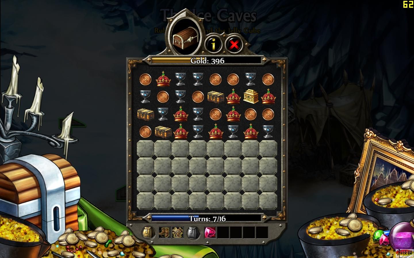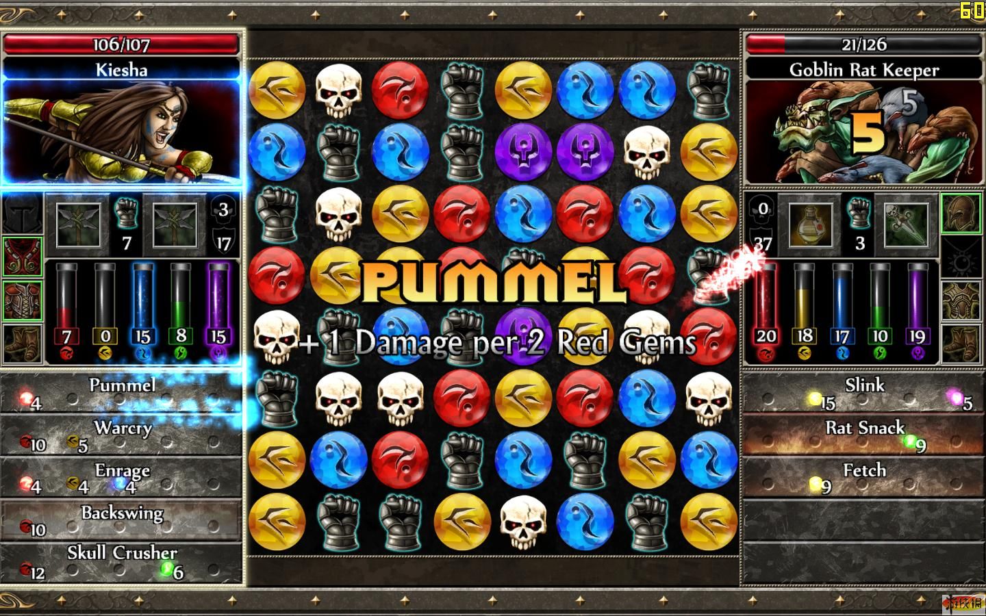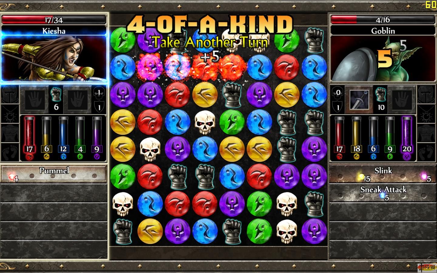 進入戰(zhàn)斗界面,玩家需要通過有效移動寶石、骷髏或拳套,每次移動要使3個以上同類排成行或列,使其消除。當寶石被消除,則獲得相應顏色和數(shù)值的法術,法術可以用來對敵人造成傷害或產生其他效果。而當骷髏被消除時,直接造成傷害。拳套是用來使用武器的,需要一定數(shù)量。戰(zhàn)斗采用回合制,雙方各移動一次。但是當成排的4個以上同類被消除時,可以額外獲得一次行動機會。