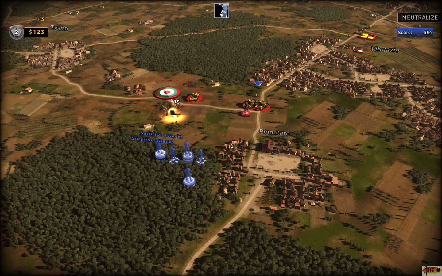 在單人游戲中玩家需要與綠色的盟軍一起作戰(zhàn)消滅德、意軍隊(duì)。不過(guò)盟軍的AI也是不高。