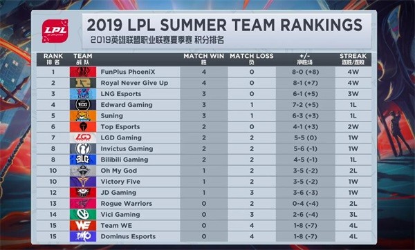 截止于6月16日的LPL夏季賽積分排名