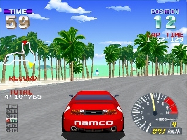 1994年12月3日,伴隨著索尼正式進(jìn)軍游戲主機(jī)市場(chǎng),《山脊賽車(chē)》也跟PS主機(jī)一起發(fā)售,并獲得了SLPS-00001這個(gè)頗有紀(jì)念意義的軟件編號(hào)。受當(dāng)時(shí)技術(shù)所限,PS版畫(huà)面移植有明顯縮水,街機(jī)版640X480分辨率60幀畫(huà)面,變成了320X240分辨率30幀,不過(guò)開(kāi)發(fā)團(tuán)隊(duì)還是做了很多努力,讓游戲成為了PS主機(jī)早期最優(yōu)秀作品之一。南夢(mèng)宮還在讀取界面加入了經(jīng)典游戲《小蜜蜂》,不僅避免了光盤(pán)讀取帶來(lái)的不良等待體驗(yàn),玩家如果過(guò)關(guān)《小蜜蜂》,還能解鎖車(chē)輛,這個(gè)“在讀取畫(huà)面時(shí)可以玩小游戲”的設(shè)計(jì)被南夢(mèng)宮申請(qǐng)專(zhuān)利,直到2015年才到期,PS版獲得了《FAMI通》37分白金評(píng)價(jià),銷(xiāo)量也達(dá)到了79萬(wàn)套,可以說(shuō)是一鳴驚人。